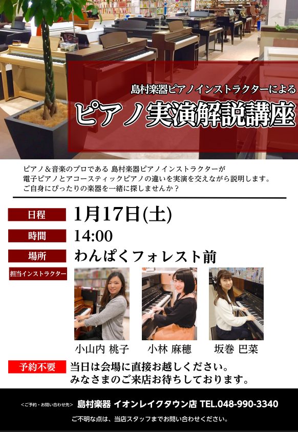 ![CONTENTSアップライトピアノの実演解説をいたします♪YAMAHA・KAWAI・PRAMBERGER・WILH.STEINBERGの弾き比べ解説とは…アップライトピアノの実演解説をいたします♪ ◯開催日時:1月17日(土) 14:00~ *約一時間程度を予定 ◯開催場所:島村楽器前のわんぱくフォ […]](https://www.shimamura.co.jp/shop/laketown/wp-content/uploads/sites/125/2026/01/20260115-20260115-ad8f334404ec5cf65f91efa589c47499.png)