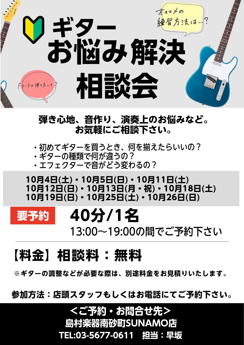 ![CONTENTS専門スタッフがギターのいろいろな相談にお答えします。専門スタッフがギターのいろいろな相談にお答えします。 初めてギターを買うとき、何を揃えたらいいの?ギターの形や値段で何が違うの?エフェクターで音がどう変わるの?などなど。ギターに関するどんなお悩みでもお気軽にご相談ください。 ご来場 […]](https://www.shimamura.co.jp/shop/m-sunamachi/wp-content/uploads/sites/124/2025/04/20250428-0bfcb892f9a6cbb93d33f2d019e026cd-1.jpg)