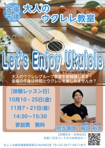 ![〜気軽に、楽しく。はじめての一曲から始まる音楽のある毎日〜 CONTENTS■ウクレレって、こんなに気軽!■担当講師■ウクレレって、こんなに気軽! 南国の音色と笑顔を運ぶ小さな楽器「ウクレレ」。軽くて音がやわらかく、指への負担も少ないので、楽器がまったく初めてという方にも人気です。 「仕事帰りに少し […]](https://www.shimamura.co.jp/shop/m-sunamachi/wp-content/uploads/sites/124/2025/10/20251013-20240608-052f3edf62220dd8e75dee6ceccd07a5-1.jpg)