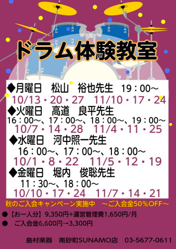 ![ドラムの魅力は、何といってもリズムで音楽を支える爽快感!「思いっきり叩いてストレス発散したい」「バンドでかっこよく演奏したい」―― そんな方におすすめのコースです。 島村楽器南砂町店では、経験豊富な講師が一人ひとりのペースに合わせて丁寧に指導します。初めての方から経験者、子どもから大人まで、安心して […]](https://www.shimamura.co.jp/shop/m-sunamachi/wp-content/uploads/sites/124/2025/10/20251013-20190528-tmp-drum.jpg)