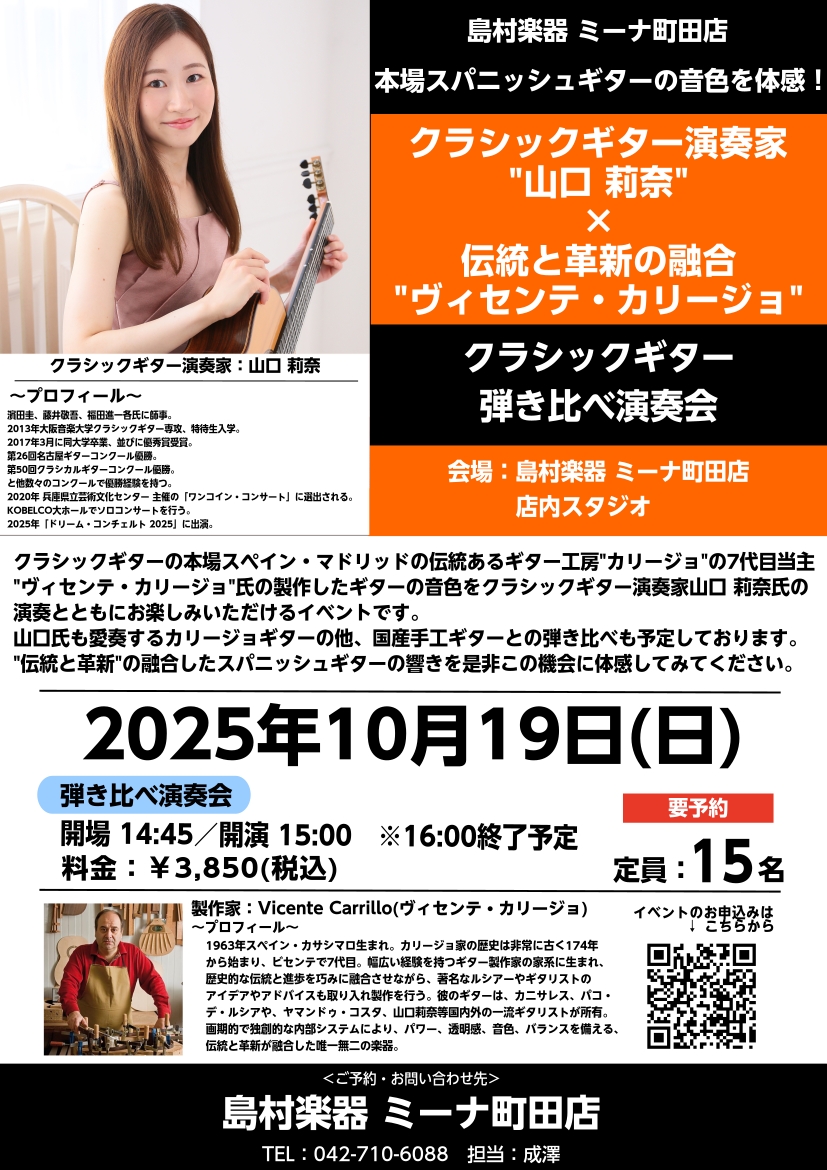 ![CONTENTSイベント紹介開催日時お申込みはこちらVicente Carrillo(ヴィセンテ・カリージョ) 氏 ~プロフィール~展示予定ギター一覧イベント紹介 島村楽器 ミーナ町田店では、10月19日(日)に注目の若手クラシックギター演奏家"山口 莉奈"さんをお招きし、ミニコンサートを開催致しま […]](https://www.shimamura.co.jp/shop/machida/wp-content/uploads/sites/121/2025/09/20251005-20250905-yamagutirina20250904-a5e18a6424b1eb664fa6d7c5709145d0-1.jpg)