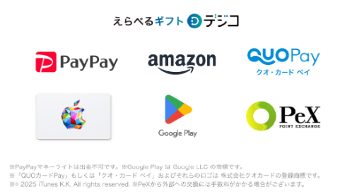 「デジコ」とは、各種ポイント・電子マネーなどに交換できるデジタルギフトコードです。PayPayやAmazonなど、以下6種類の中からお好きなデジタルギフトをお選びいただけます。