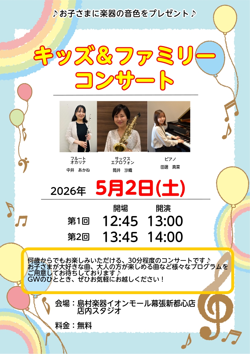 2026年5月2日(土)、当店インストラクター3名による「キッズ&ファミリーコンサート」を開催いたします!