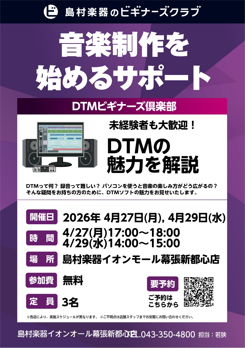 ![経験者はもちろん、DTMやDJなどに興味はあるけれど何から手を出せばいいか分からない。形になるビジョンが見えない。などなど不安をお持ちの方へ...ボカロ,アニソンなどは誰かが作ったものを見たり聴いたりするのももちろん楽しいですが、自分で作ったり遊んだりするともっともっと楽しいのです!!幕張でイベント […]](https://www.shimamura.co.jp/shop/makuhari/wp-content/uploads/sites/158/2026/04/20260413-img_2383.jpg)