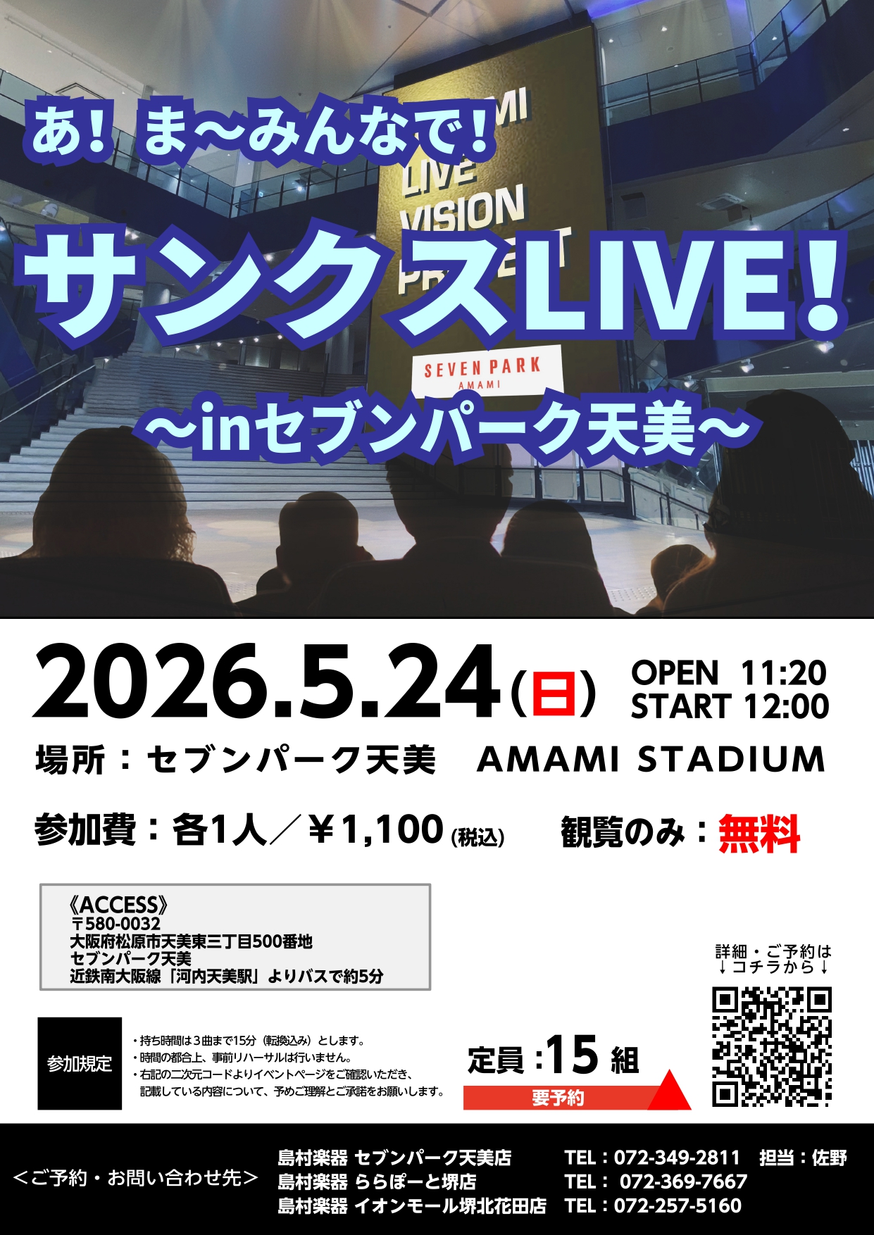 今回は【セブンパーク天美店×ららぽーと堺店×イオンモール堺北花田店の合同ライブ】です♪こんなに大きなステージでの演奏はなかなか出来ません…!皆で楽しく盛り上がりましょう!