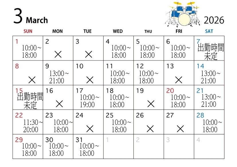 ◎当店のドラムアドバイザー 紹介&出勤スケジュール