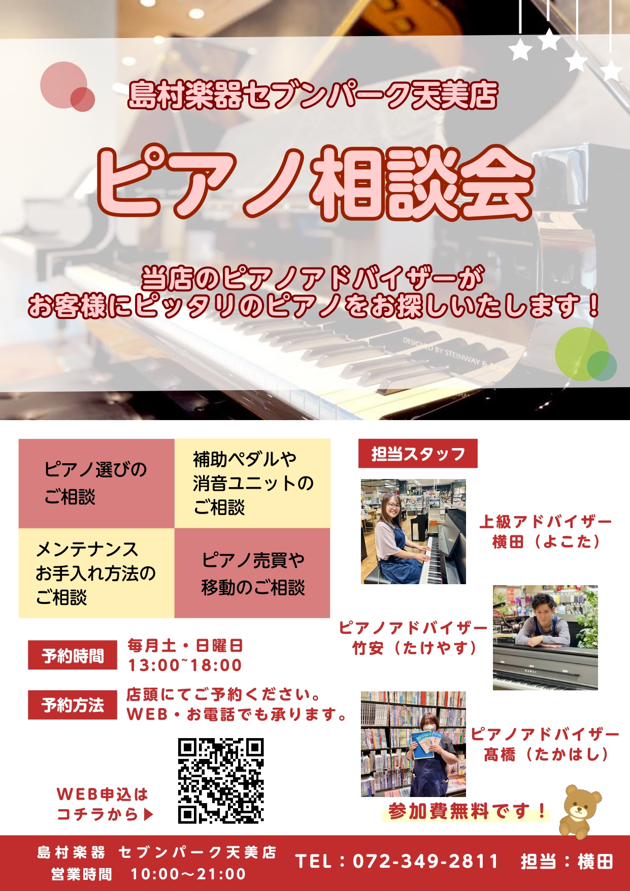 ![CONTENTSピアノのお悩み、何でも解決いたします開催日 ※参加費無料ですピアノアドバイザー(社内資格)のご紹介お申し込み方法大切なピアノ選びは島村楽器セブンパーク天美店へ。ピアノのお悩み、何でも解決いたします ピアノと電子ピアノどっちがいいのか悩んでいる・・・メーカーごとの音色、タッチ感の違いが […]](https://www.shimamura.co.jp/shop/matsubara-amami/wp-content/uploads/sites/203/2024/03/20240323-image.jpg)