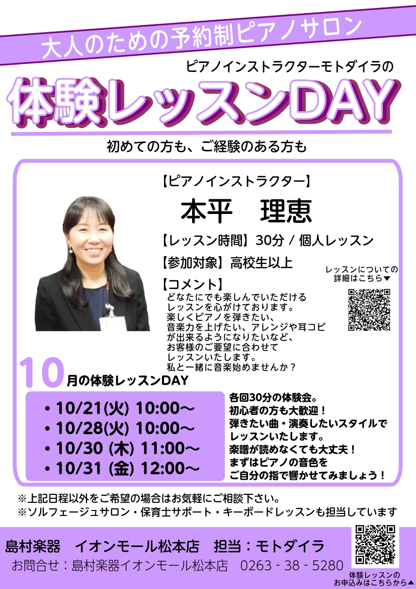 島村楽器イオンモール松本店【松本市で始める大人のピアノレッスン】只今ご入会キャンペーン中!初めての方も経験者の方も大歓迎♪インストラクター本平理恵 10月の無料体験レッスン