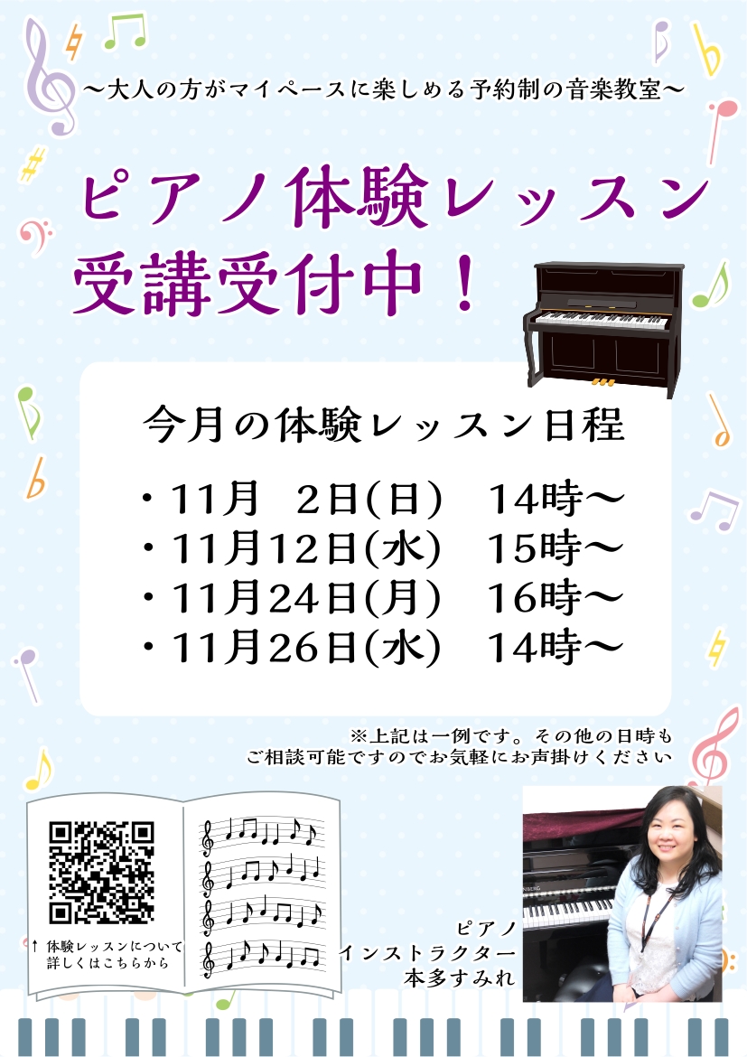 11月30日までご入会キャンペーン実施中!今だけご入会金50%OFF!『音楽で毎日に彩りを♪』11月無料体験レッスン受付中【 松本市 大人のためのピアノ教室 イオンモール松本で大人から始める予約制ピアノレッスン♪ 】本多 すみれ