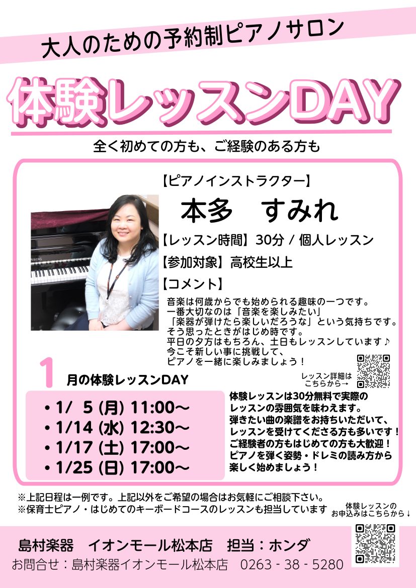 『新しい年、新しい趣味をはじめませんか♪1月体験レッスン受付中【 松本市 大人のためのピアノ教室 イオンモール松本で大人から始める予約制ピアノレッスン♪ 】本多 すみれ