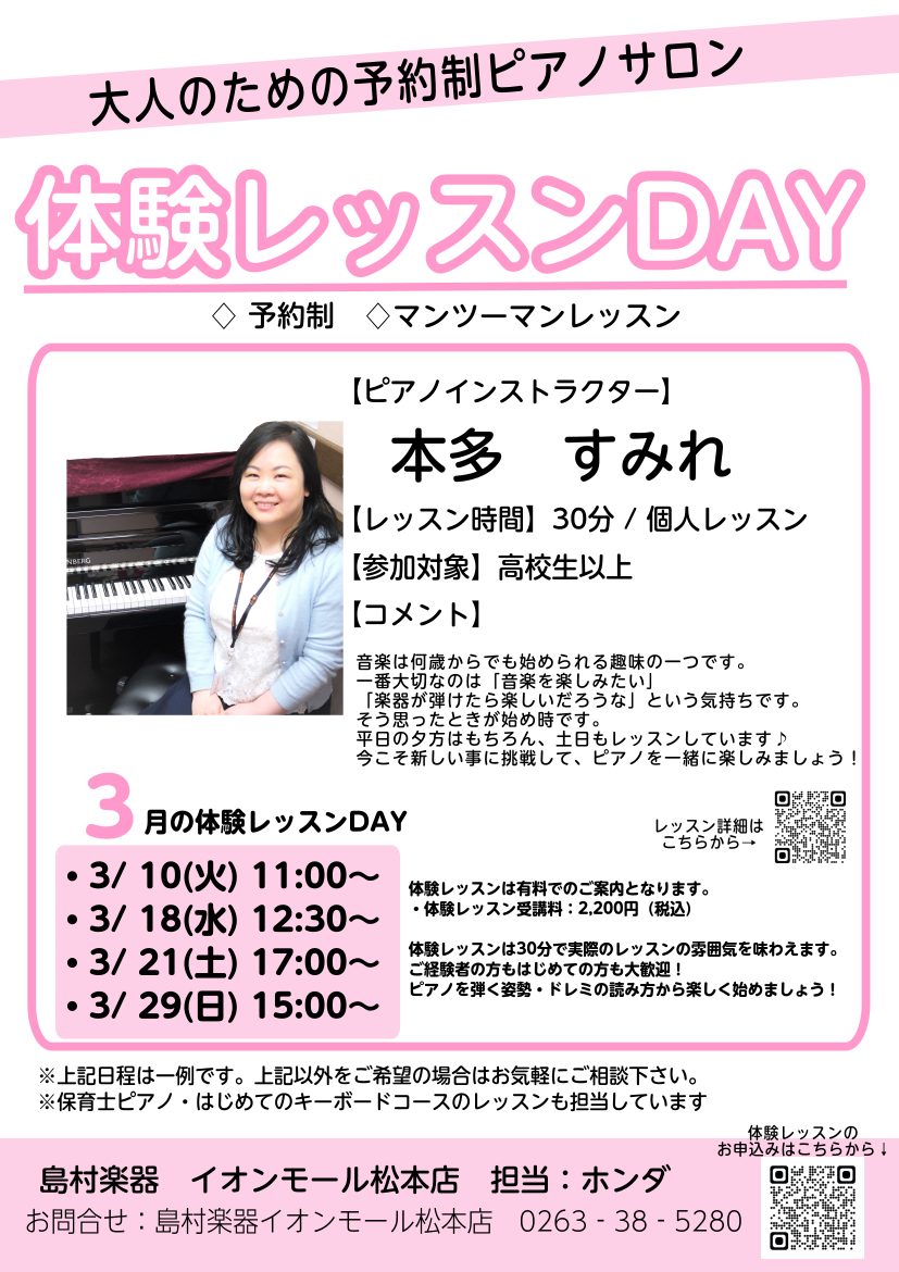 『ピアノで毎日に彩りを♪』2月・3月体験レッスン受付中【 松本市 大人のためのピアノ教室 イオンモール松本で大人から始める予約制ピアノレッスン♪ 】本多 すみれ