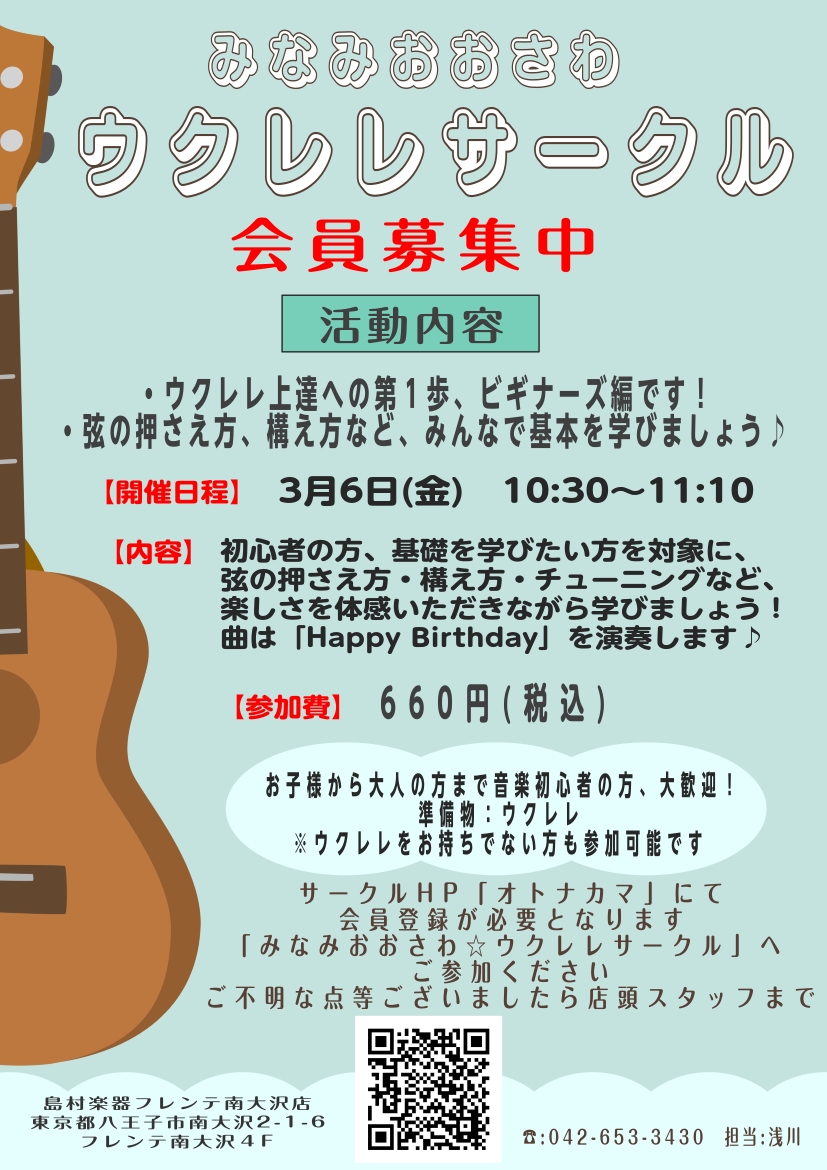 ![みなさま、こんにちは♪フレンテ南大沢店のウクレレ担当、浅川と申します。 3月のウクレレサークル開催のご連絡です!今月は2回開催で、ドライフラワーを演奏曲で楽しむ「アンサンブル」編と、ウクレレ初心者向けの「ビギナーズ」編を実施いたします!こちらの記事は「ビギナーズ編」の内容となっております。アンサンブ […]](https://www.shimamura.co.jp/shop/minamiosawa/wp-content/uploads/sites/137/2026/02/20260214-happybirthday.jpg)