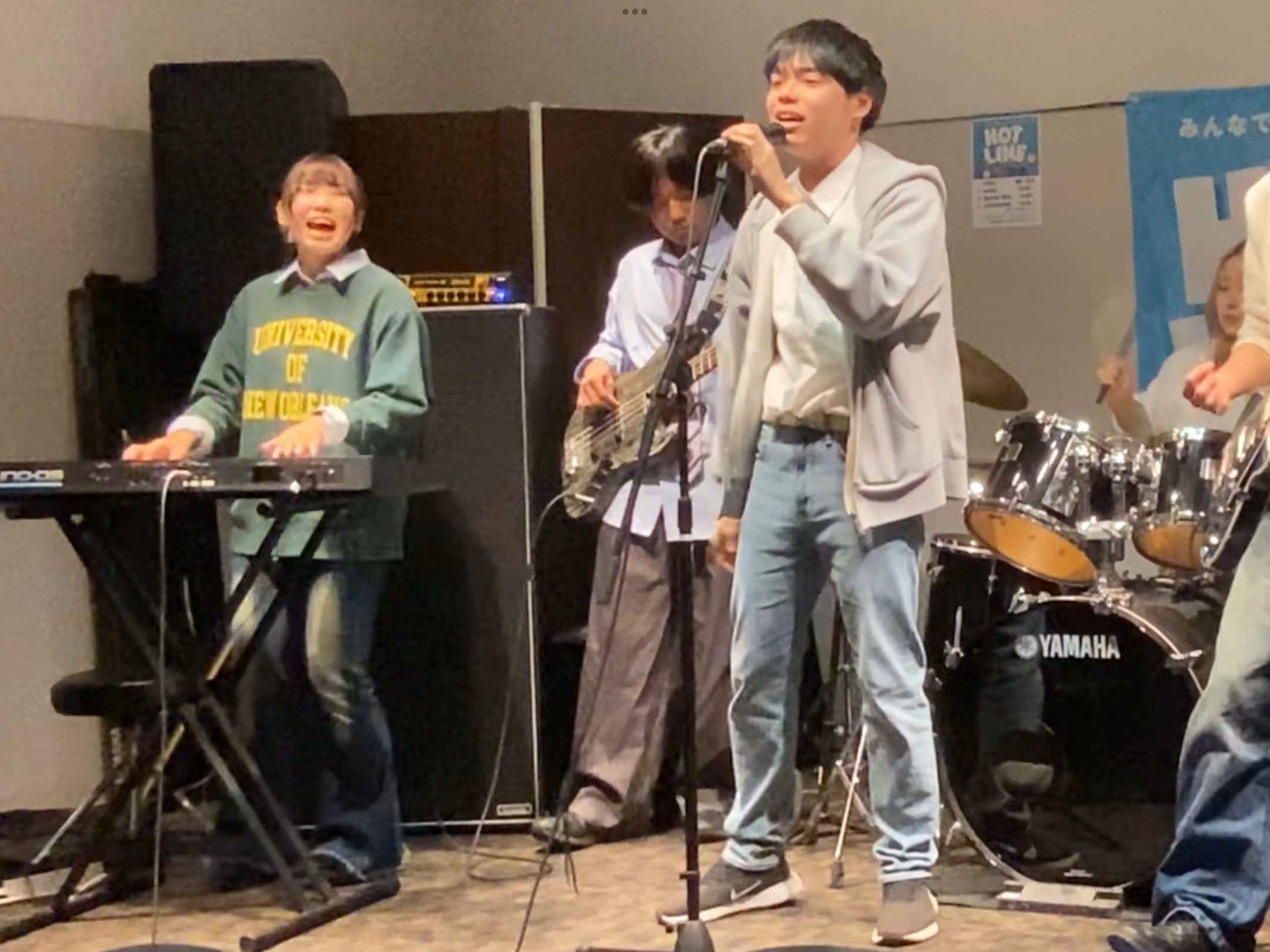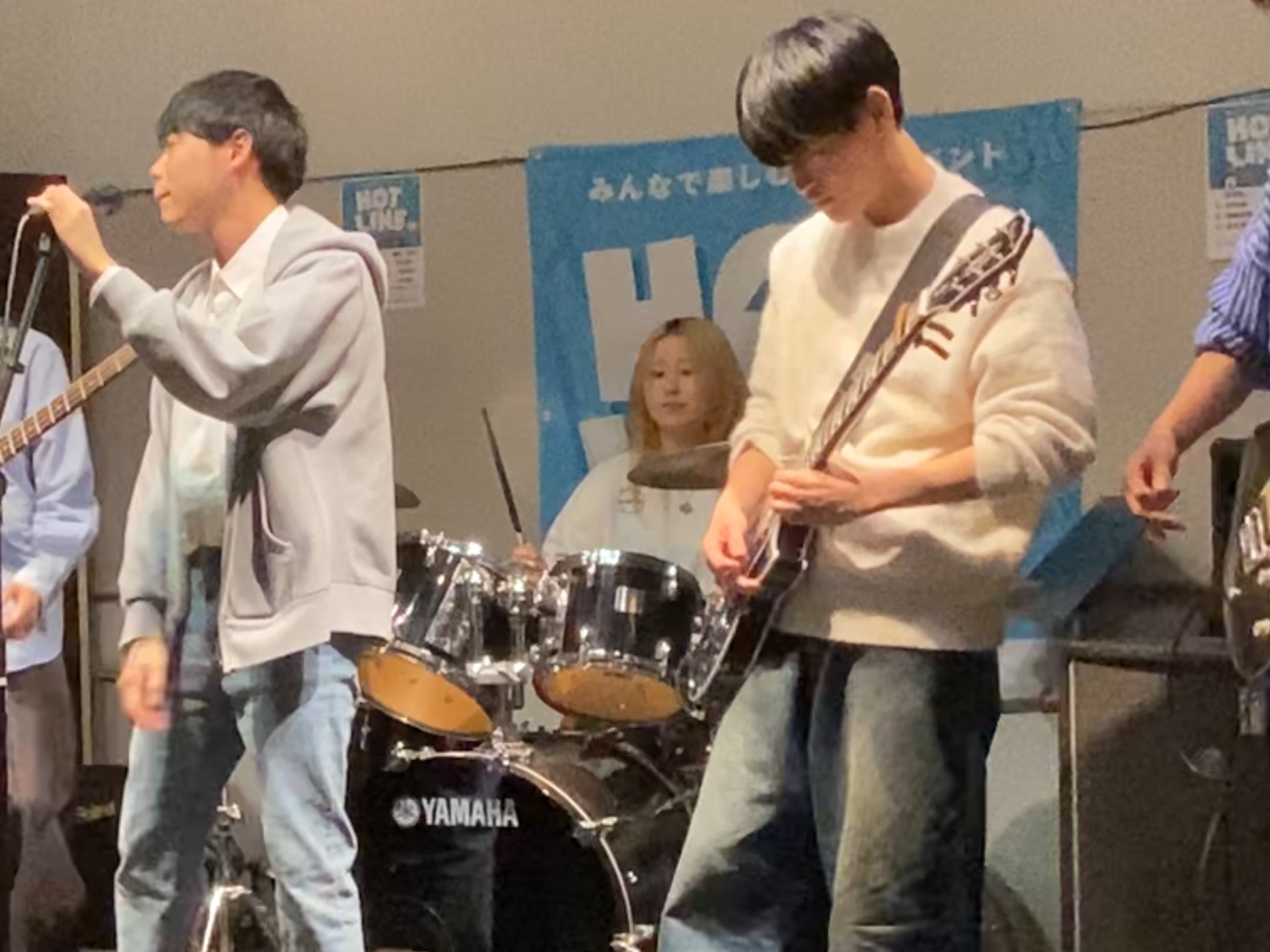 トップバッターは大学のサークルで組まれた6人組バンドのacross様。「Mrs. GREEN APPLE・StaRt」を熱い演奏で会場を大いに盛り上げてくださいました。心から楽しそうにライブをしているのが笑顔と真剣な表情とから伝わり、手拍子を交えた演奏でオーディエンスも身体を揺らしながら一体となってライブ楽しんでいる、素敵な演奏でした。2/22の立川でのライブもぜひ楽しんで素敵な演奏を奏でてください。