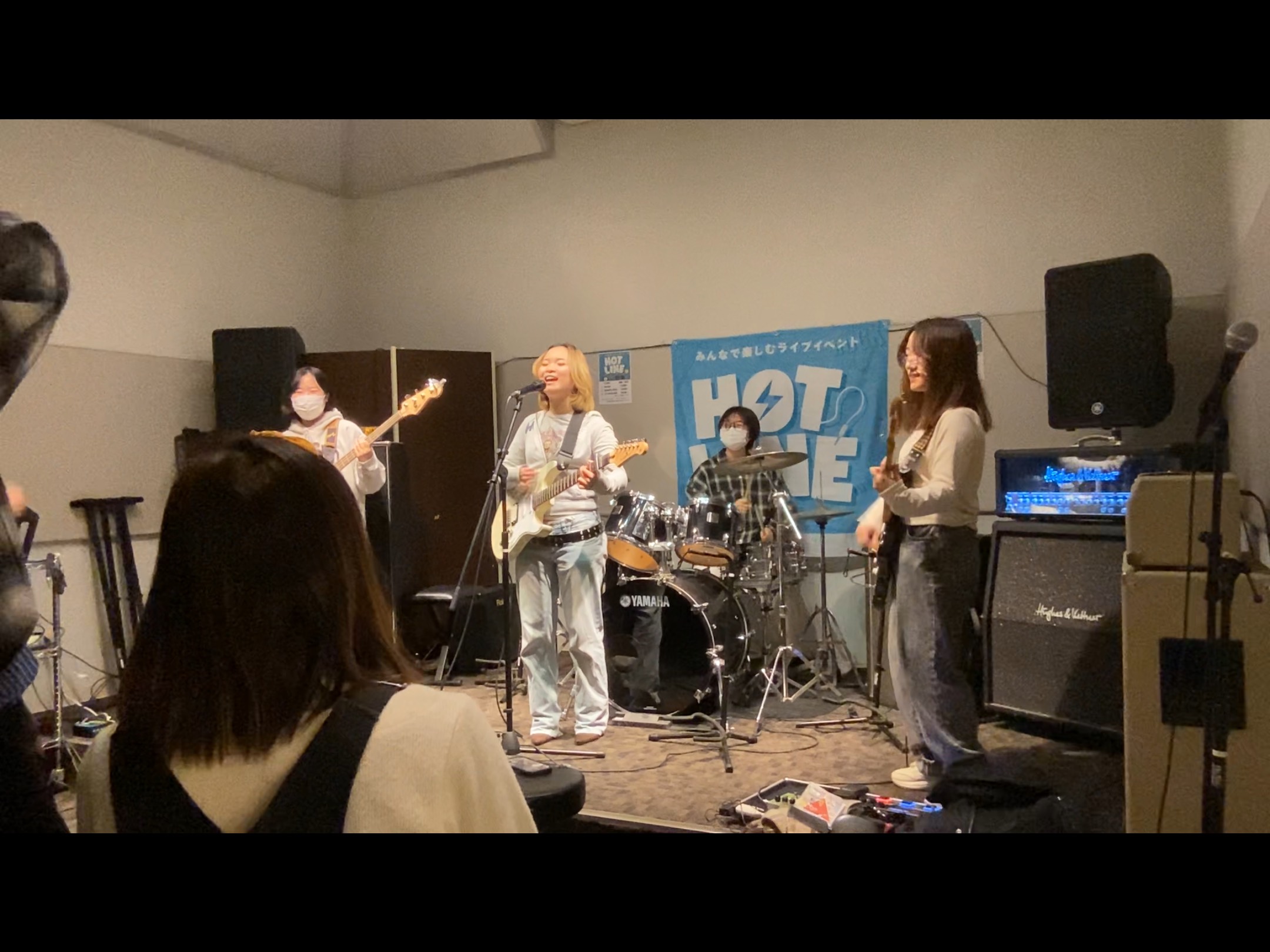 2番手は大学生4人組ガールズバンドのSparkle girls様。各々違うバンドのメンバーが先日ライブをした際に組んで意気投合し、本日もこのメンバーでご出演いただきました。演奏前に部屋を真っ暗にして出囃子のミュージックを流し、照明が明るくなったタイミングで登場する演出で会場の心をつかみ、「ONE OK ROCK・Deeper Deeper」「 超☆社会的サンダル・可愛いユナちゃん」「土屋アンナ・rose」を熱い演奏で盛り上げていただきました。