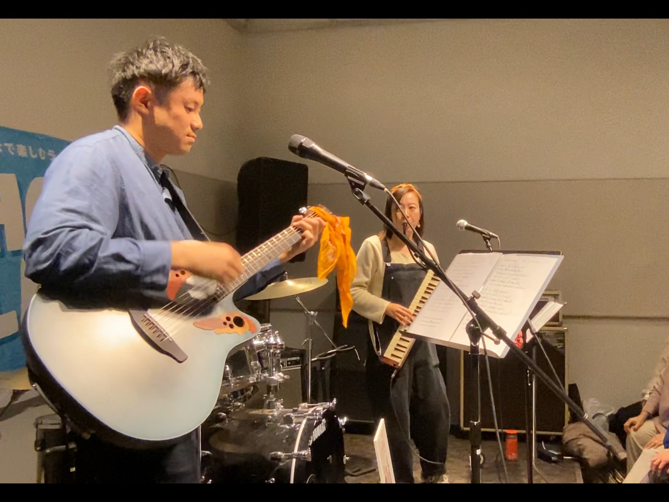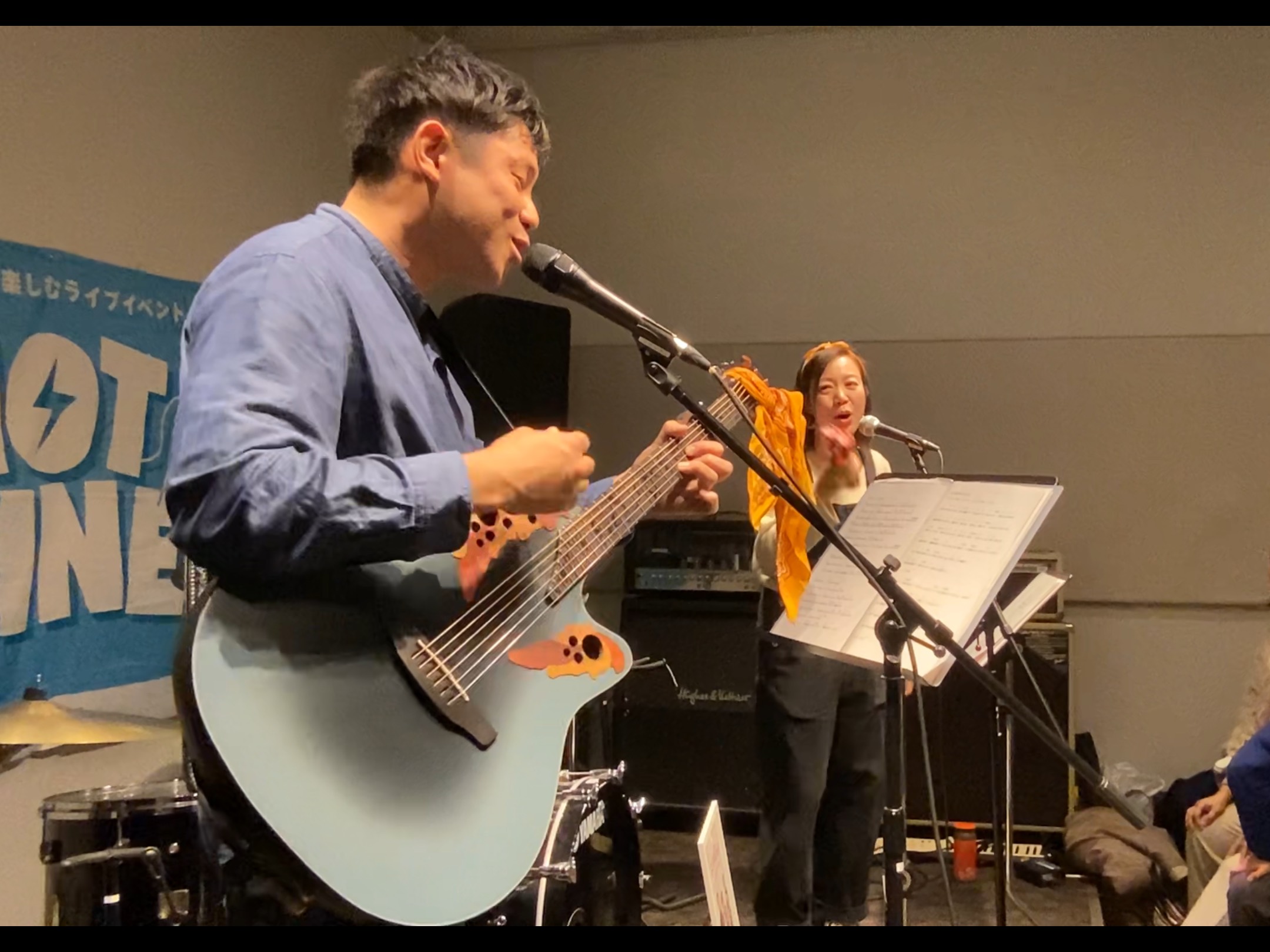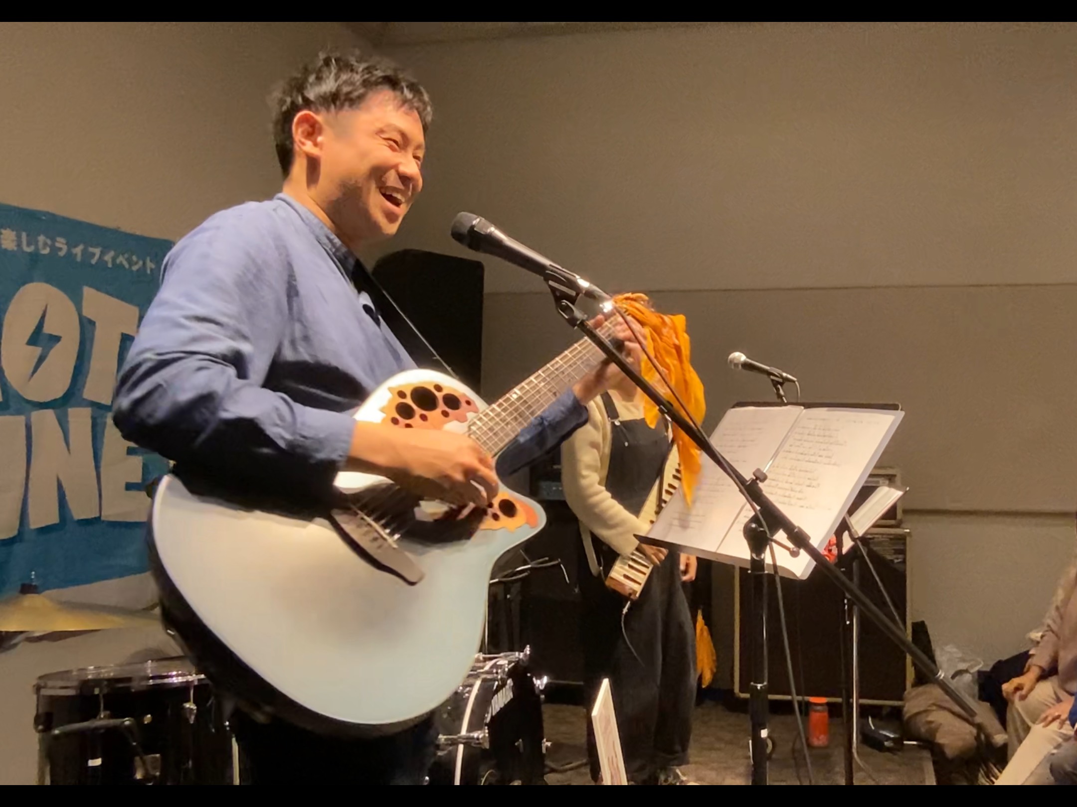 3番手はよりみちorbit様。お二人とも普段は学校の先生で、教え子様とそのご父兄様のた~くさんの方々がライブを観にご来場いただきました。「銀杏BOYZ・BABY BABY」「19・あの紙ヒコーキ くもり空わって」を2曲カバーの後は、”失敗してもいい、3歩進んで2歩下がったって1歩進んでる、大丈夫、自分の足で1歩1歩進んでいこうぜ”というメッセージが込められたオリジナル曲「レベルアップ」を披露。クラスのテーマ曲の1つということもあり、会場が一体となった素敵なライブでした。