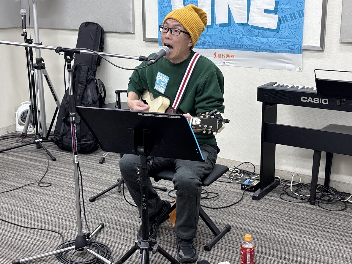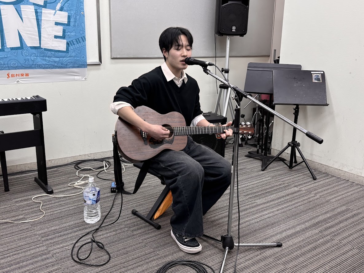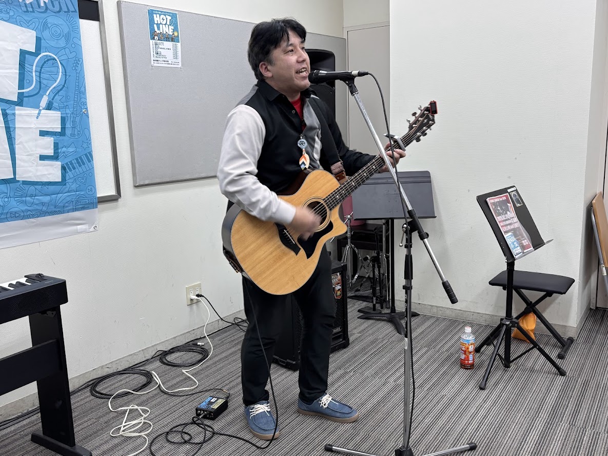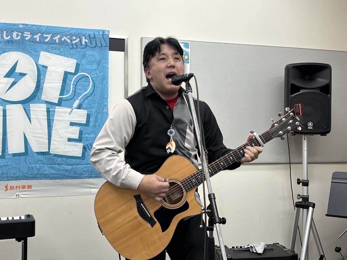 オープニングを飾っていただいたのは、当店ヴォーカル教室生徒のますいようた様。演奏曲は1曲入魂、「優里・ドライフラワー」を熱唱!約半年前のらぶたみ(南大沢店インストアライブの名称)での人生初となる弾き語りの曲も本日同様にドライフラワーでしたが、ヴォーカルもギターも格段に上達していて、何より堂々と演奏されている姿に胸が熱くなりました!
