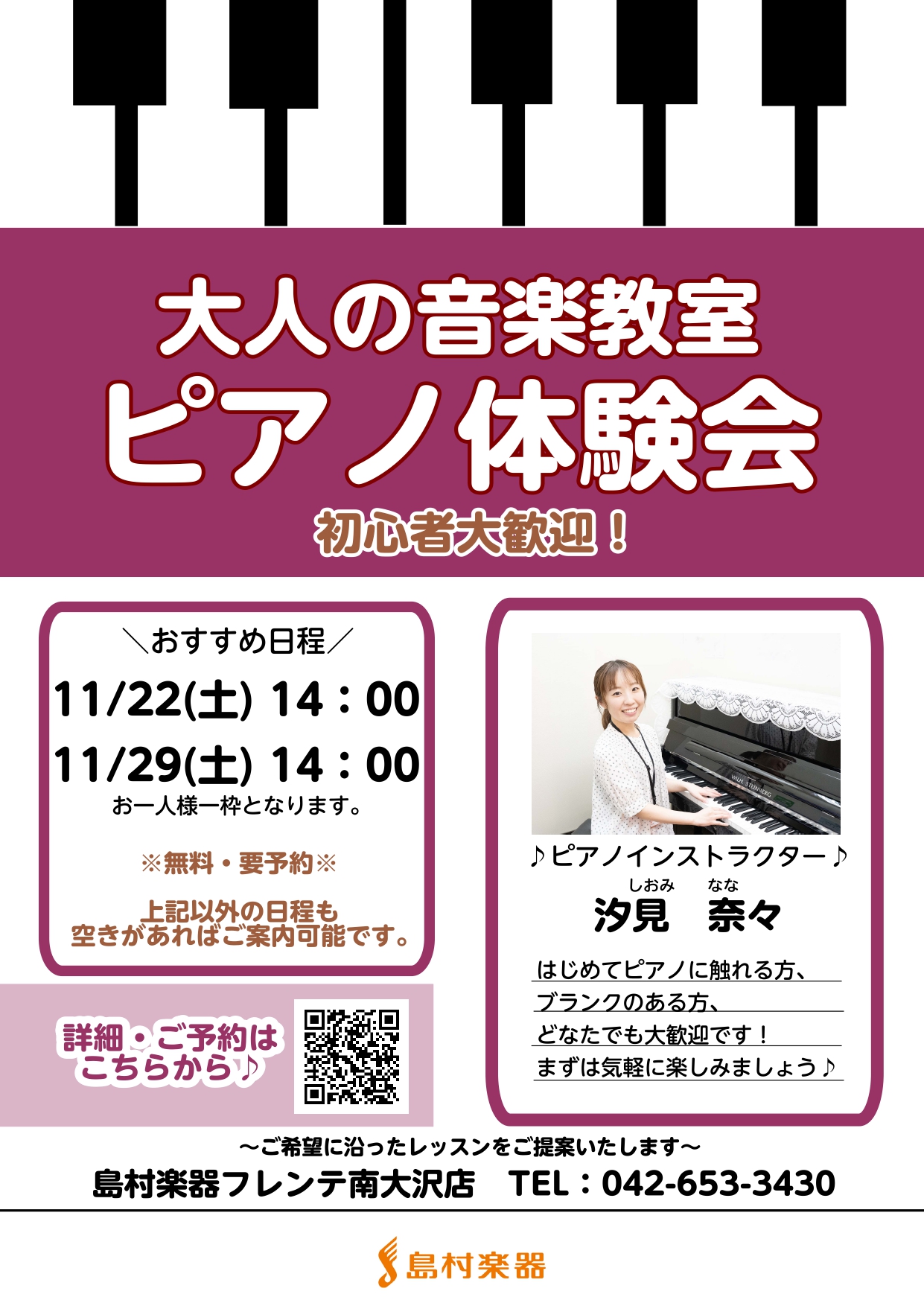 ![CONTENTS憧れのピアノにチャレンジしてみませんか?お申込み方法体験会について体験レッスンの内容担当インストラクターアクセス方法憧れのピアノにチャレンジしてみませんか? 皆さまこんにちは!島村楽器南大沢店 ピアノインストラクターの汐見です。大人のピアノ教室のレッスンを担当しています。新しい趣味と […]](https://www.shimamura.co.jp/shop/minamiosawa/wp-content/uploads/sites/137/2025/10/20251029-b91e251f8fdd1155d5c0c090fe9758df-2.jpg)