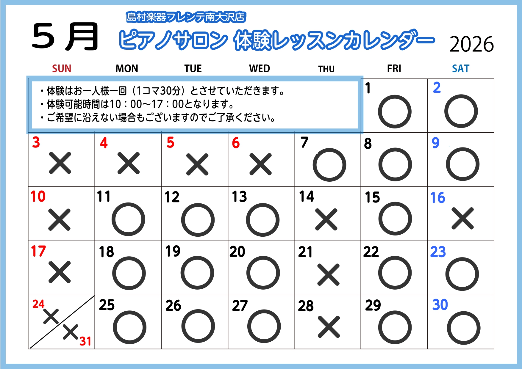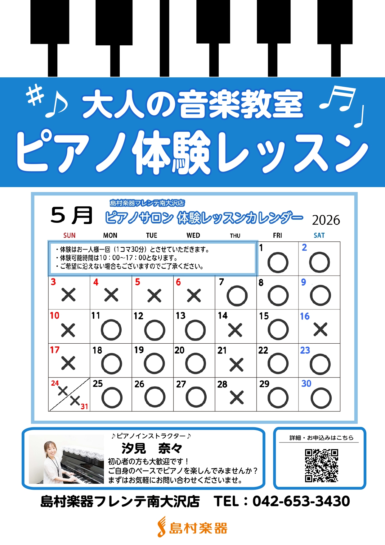 ![CONTENTS憧れのピアノにチャレンジしてみませんか?体験レッスンってどんな感じ?5月の体験レッスンについて大人のピアノ教室「ピアノサロン」についてお申込みについてアクセス方法憧れのピアノにチャレンジしてみませんか? 皆さまこんにちは!島村楽器南大沢店 ピアノインストラクターの汐見です。大人のピア […]](https://www.shimamura.co.jp/shop/minamiosawa/wp-content/uploads/sites/137/2026/04/20260427-shima260422-0022-1_page-0001-1.jpg)
