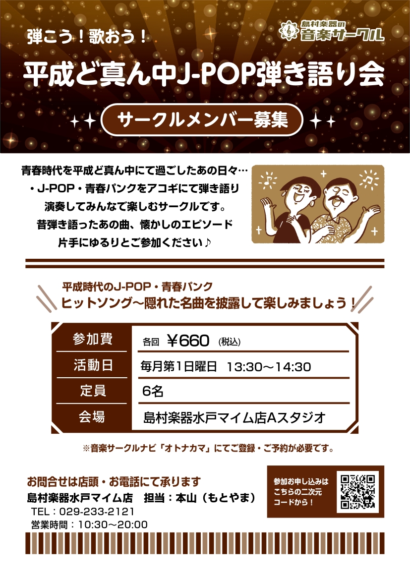 CONTENTS平成ど真ん中J-POP弾き語り会島村楽器水戸マイム店イベント公式LINE水戸マイム店音楽教室担当スタッフ紹介平成ど真ん中J-POP弾き語り会 皆さまこんにちは、こんばんは!スタッフもとやまですっ! 青春時代を平成ど真ん中にて過ごした皆さま(1970年代後半~1990年代生まれ)!J- […]