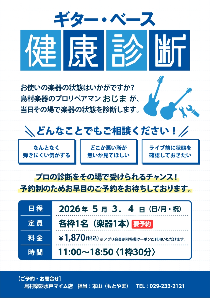 ![5/3(日)/4(月・祝)浅草橋ギター&リペア店よりリペアマン小嶋(おじま)が参ります! ご好評につき今回は2日間連続開催となります!!ご自身の楽器をプロの技術者に直接診てもらえるまたとない機会となっております。ぜひご参加ください! CONTENTSギター・ベース健康診断(ウクレレもOKです!)空き […]](https://www.shimamura.co.jp/shop/mito/wp-content/uploads/sites/42/2025/11/20251104-20250722-20220322-gs_0003_sq.jpg)