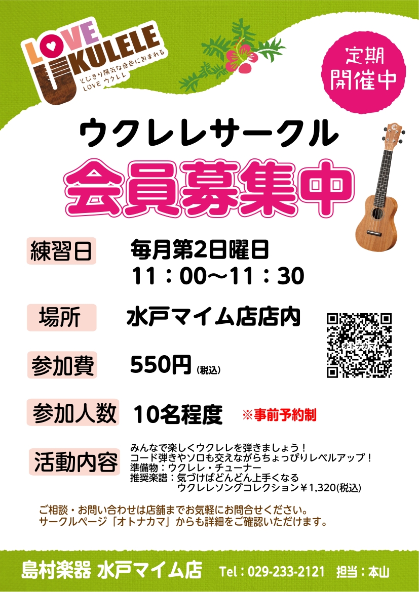 **参加希望の方はこちらのページからお申込みください [https://www.shimamura.co.jp/shop/mito/circle-info/水戸ウクレレサークル::title=水戸マイム店ウクレレサークル オトナカマ登録ページ] *ウクレレサークルとは? ウクレレサークルは、参加自由 […]