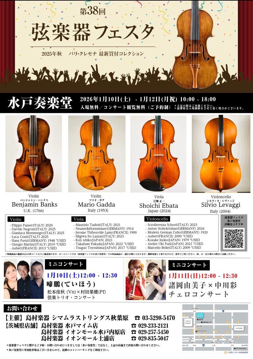 ![~2025秋 パリ・クレモナ 最新買付コレクション~ 皆さま、今年も弦楽器イベントの開催が決定しました!2026年1月10日(土)~1月12日(月・祝)の3日間、水戸奏楽堂にて「弦楽器フェスタ」を開催いたします。 会場では、バイオリン・ビオラ・チェロのほか、各種弓や関連アクセサリーも多数展示。実際に […]](https://www.shimamura.co.jp/shop/mitouchihara/wp-content/uploads/sites/204/2025/12/20251212-d8f6768289a722c3bfd8f91f5637d8c5.jpg)