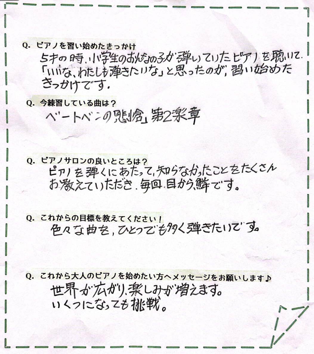 【大人のピアノ教室】レッスン会員様のお声 Vol.2 ~70代女性Kさんの場合~