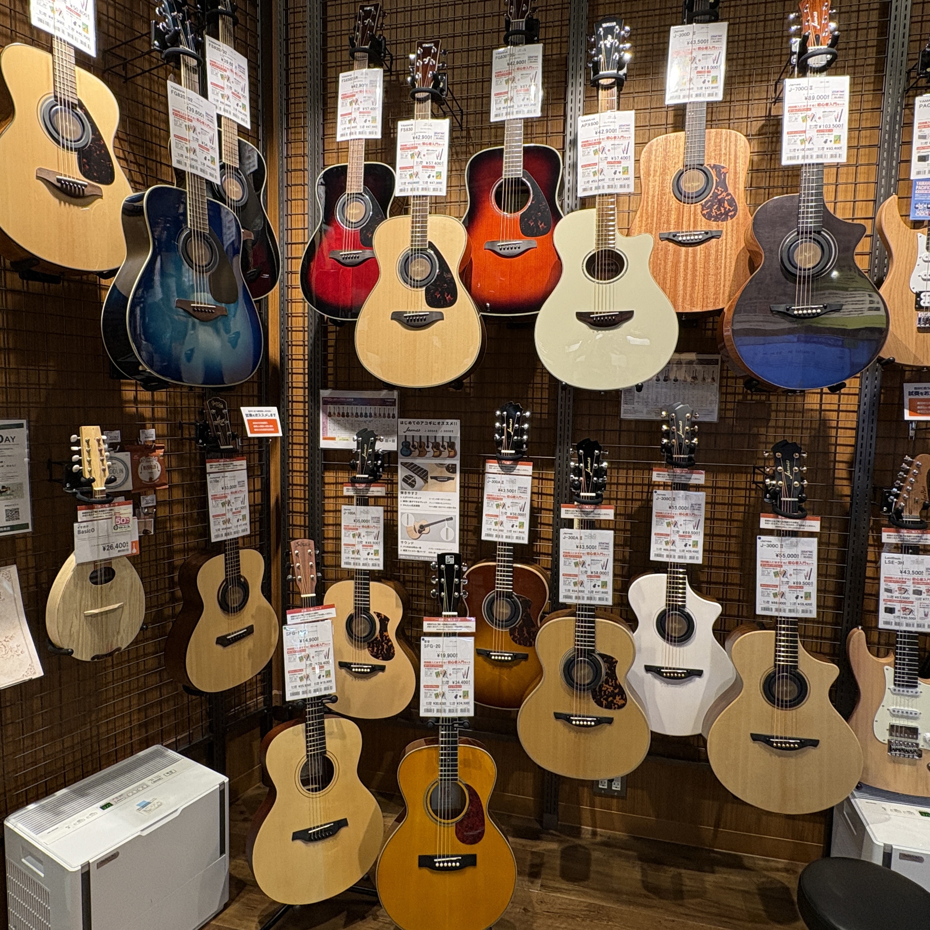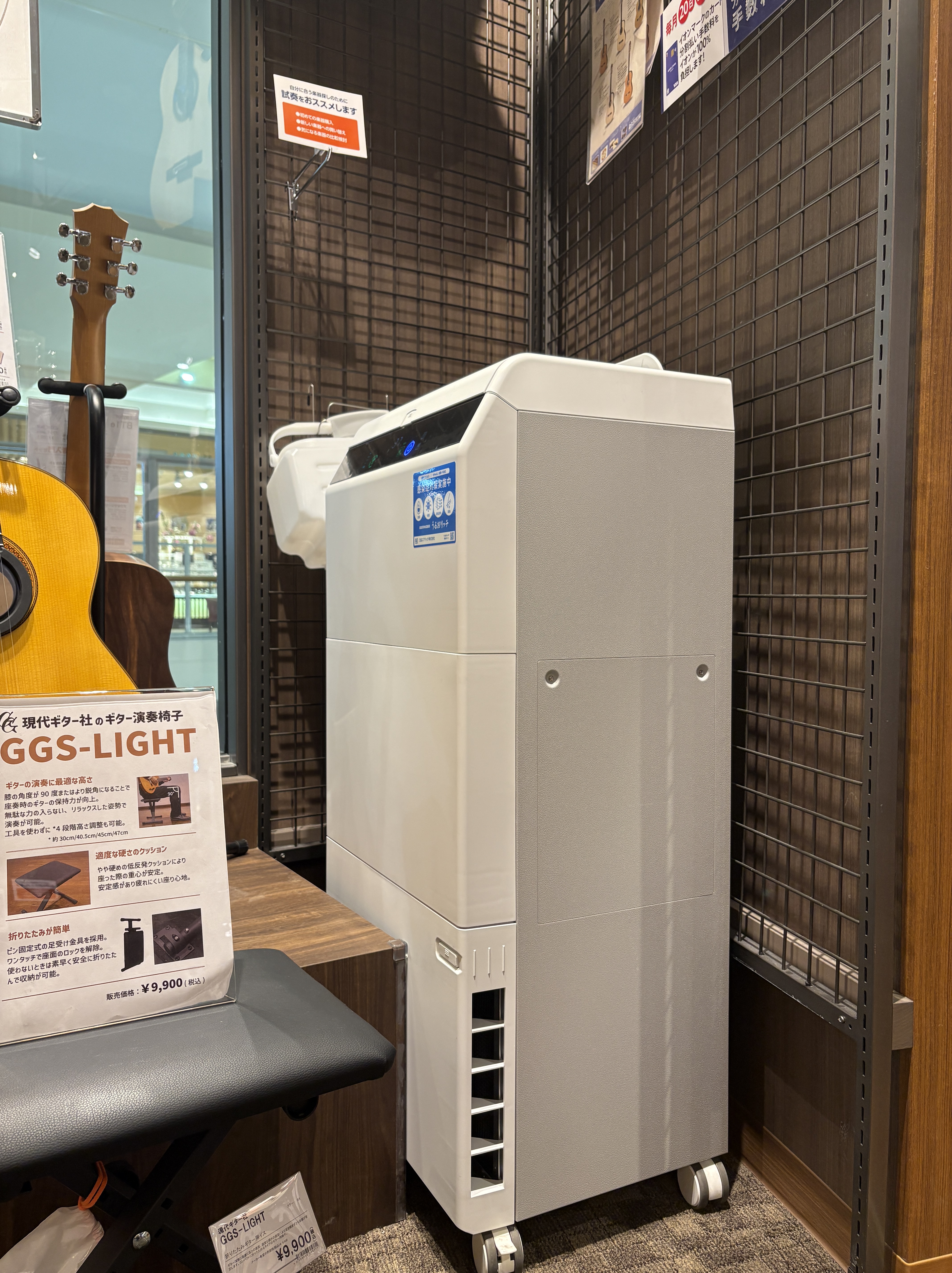 当店のギター展示コーナーは、24時間体制で適切な湿度管理を行っています。常にベストな状態でお客様に試奏していただけるよう、毎日1本ずつ丁寧に点検しています。