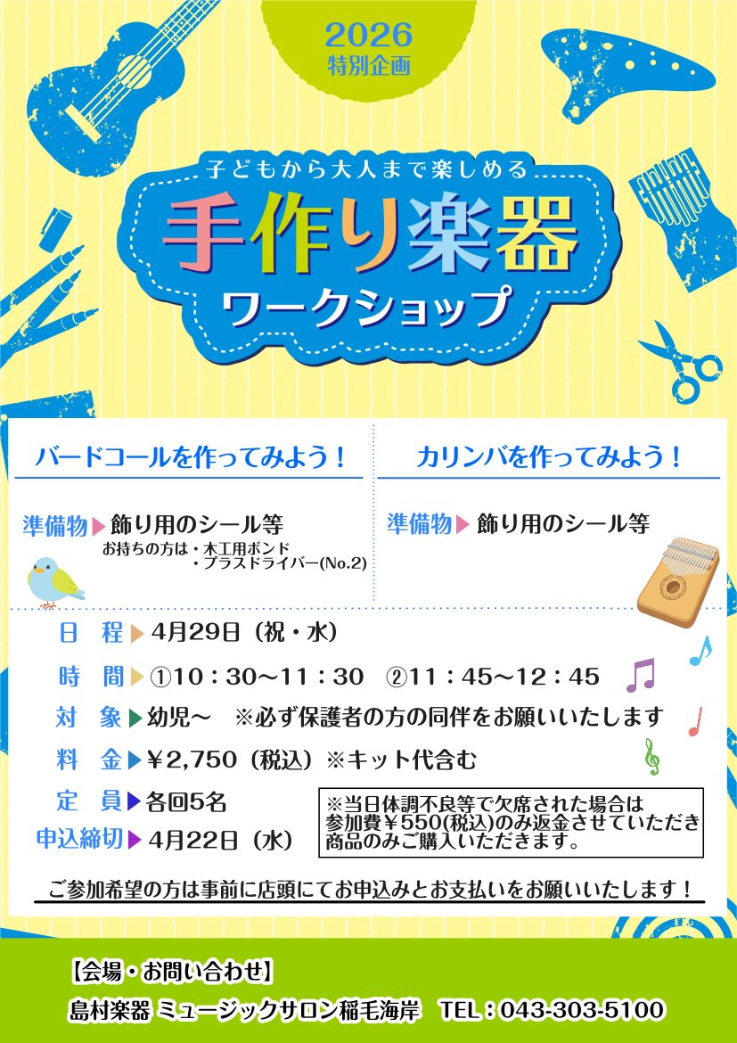![毎年大人気の工作イベント✂️今年はバードコールとカリンバを作ります!みなさまのご参加お待ちしております♪ CONTENTS開催日程ご予約・お問い合わせこれまでのイベントの様子ミュージックサロン稲毛海岸 イベント情報体験レッスン受付中!教室は駅から徒歩2分!開催日程 ご予約・お問い合わせ これまでのイ […]](https://www.shimamura.co.jp/shop/ms-inage/wp-content/uploads/sites/114/2026/03/20260323-4255ecad936e4cd1e7822b7cd9d7c05e.png)
