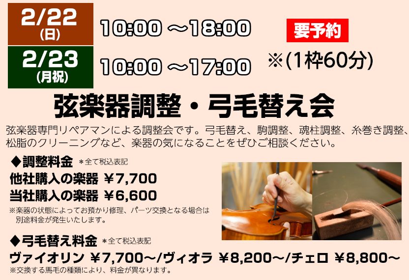 弓の毛の貼り替え、駒調整、魂柱調整、松脂のクリーニング糸巻き調整など、楽器の気になることをぜひご相談ください。