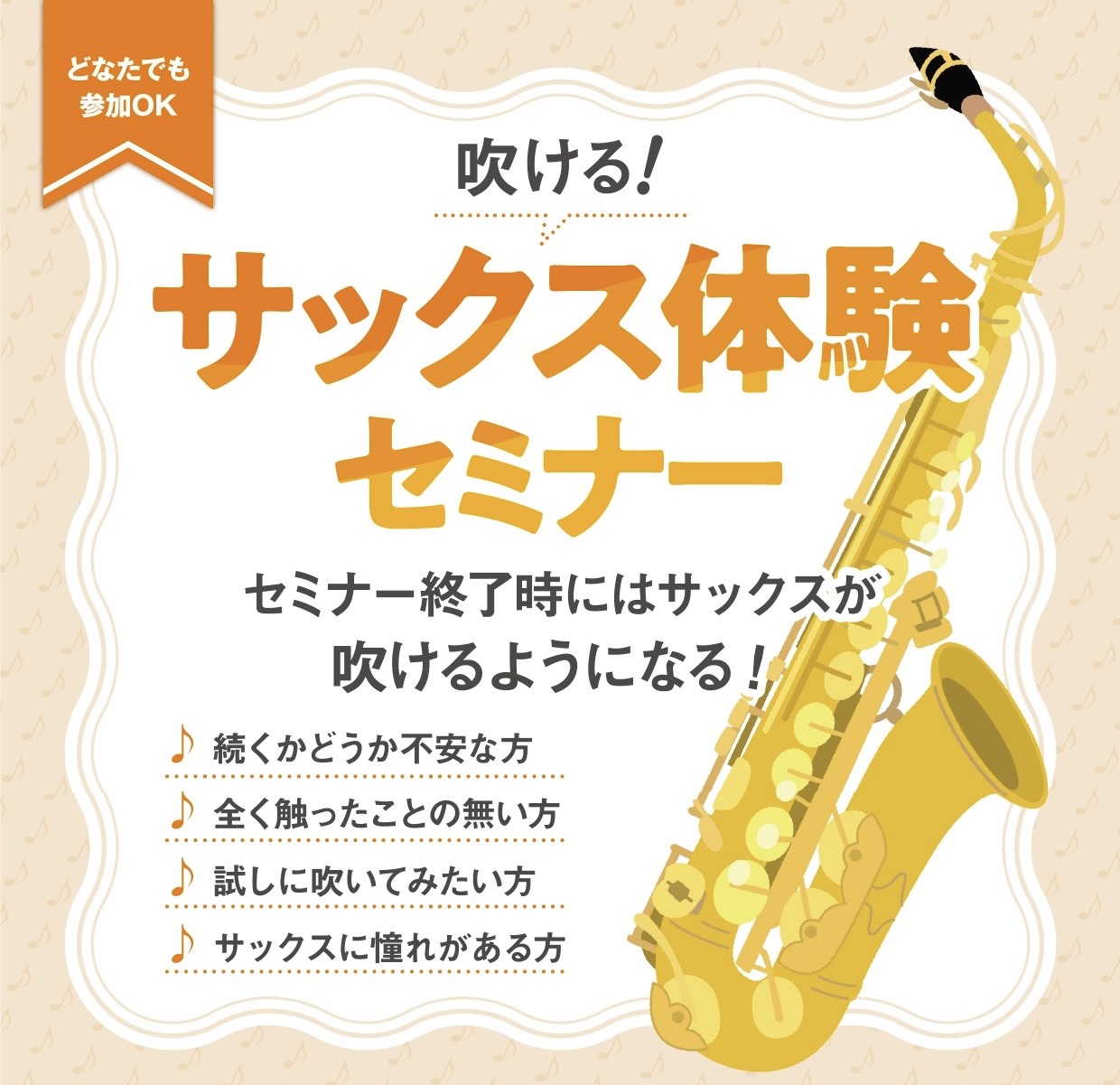 レッスンを考える前に本当に自分でも吹けるのか不安...。という方にも気軽に試していただける、スタッフによる体験セミナーを定期的に開催しております♪30分後にはサックスが吹けていること間違いナシ!