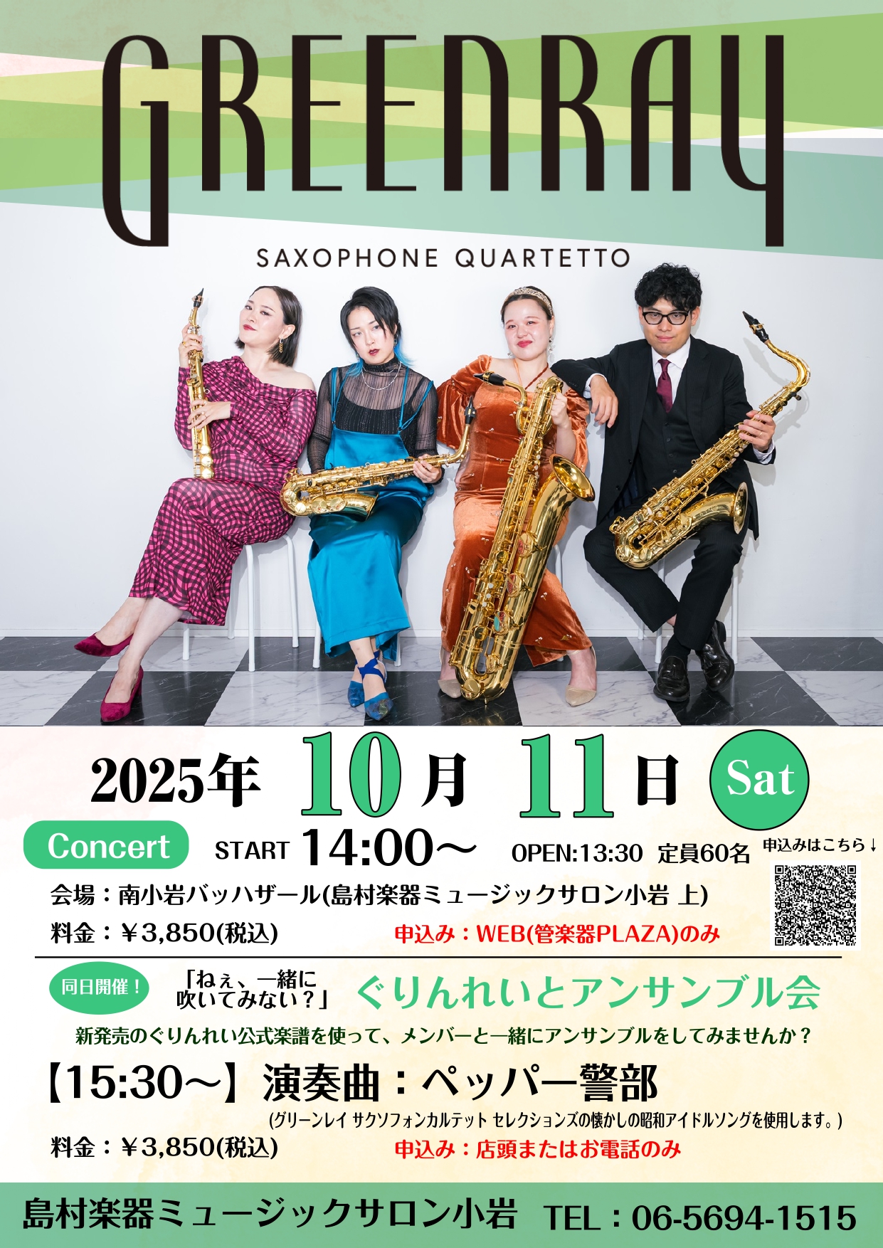 10月11日(土)、当店ミュージックサロン小岩にてサックス点検会を開催いたします! 快適に楽器演奏が楽しめるよう、この機会にぜひご自身の楽器の状態をチェックしてみませんか?   CONTENTS開催概要WEBでのご予約はこちら同日開催!グリーンレイ・サクソフォンカルテット 島村楽器ツアーin小 […]