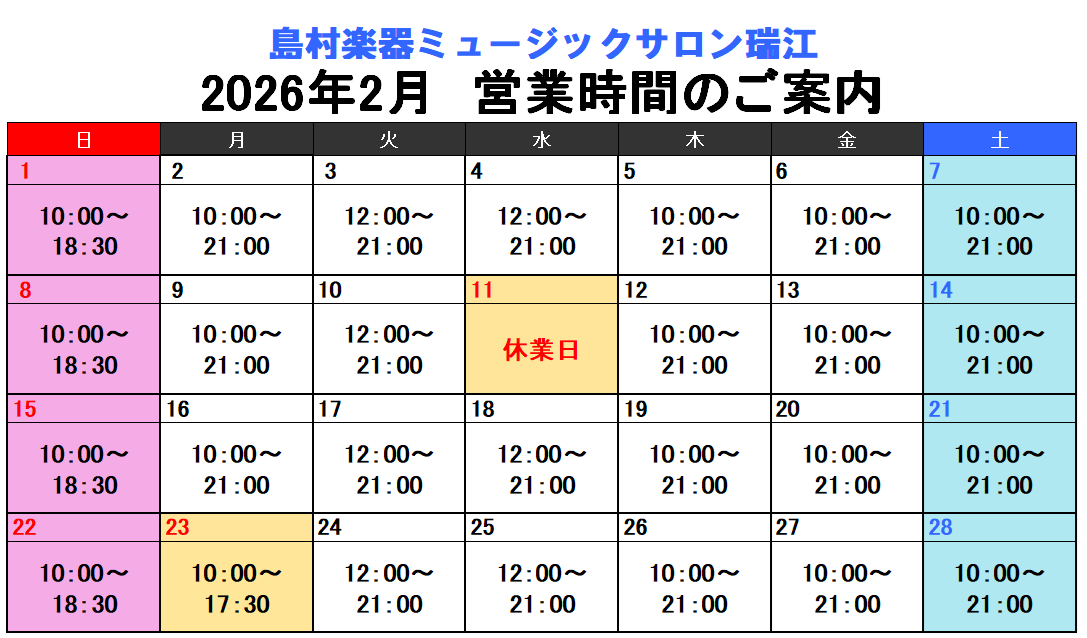 ミュージックサロン瑞江 2026年2月営業日に関しましては下記一覧表をご覧ください。