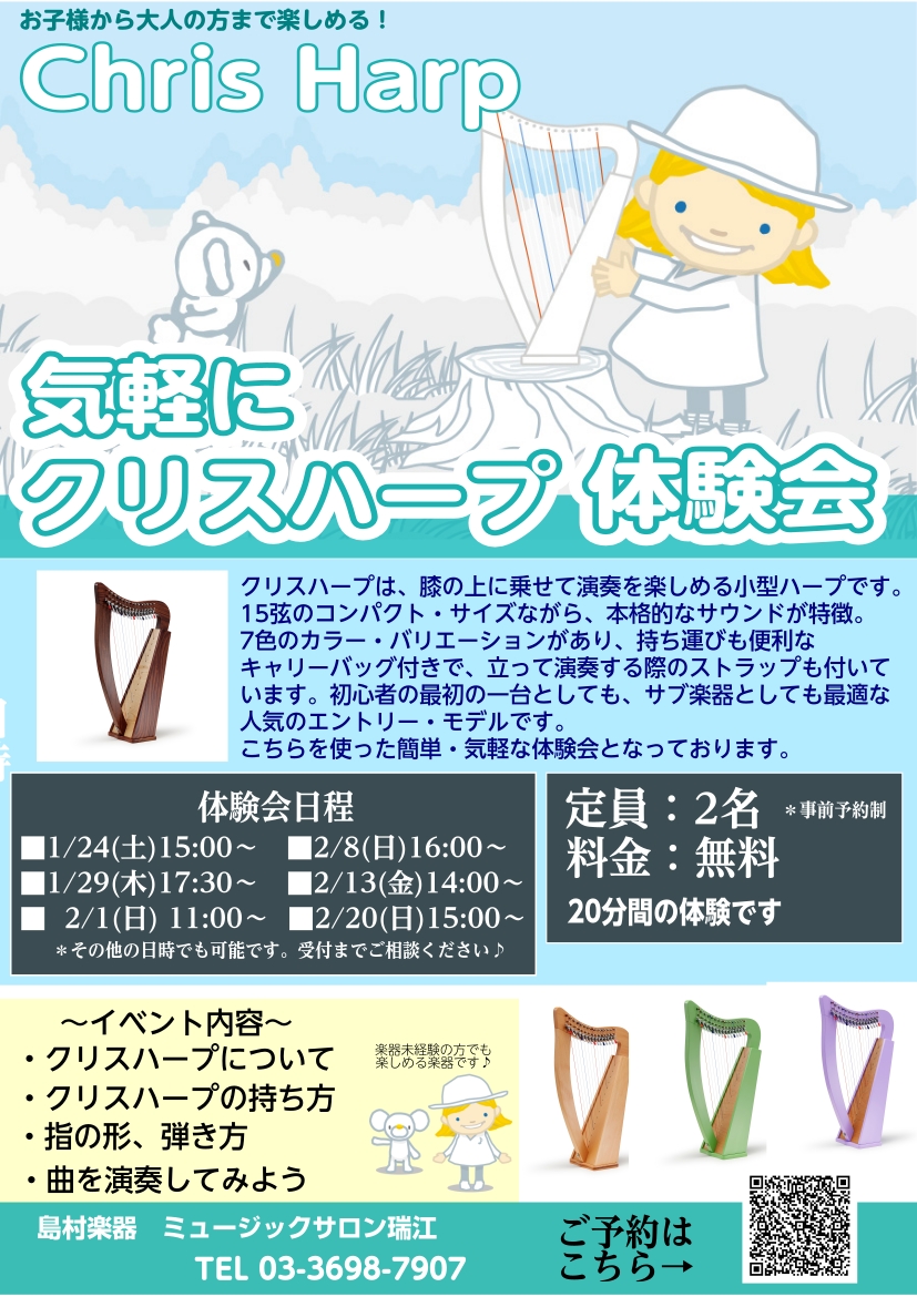 1/16(金)~2/22(日)までクリスハープフェアを実施いたします。 ハープと聞くと大きいイメージがありますが、今回はひざ乗せサイズの15弦レバーハープ「クリスハープ」の展示となります。あのハープをお気軽に楽しんでいただくことができます! クリスハープ体験会の実施が決定しました♪ 持ち方などの基本 […]