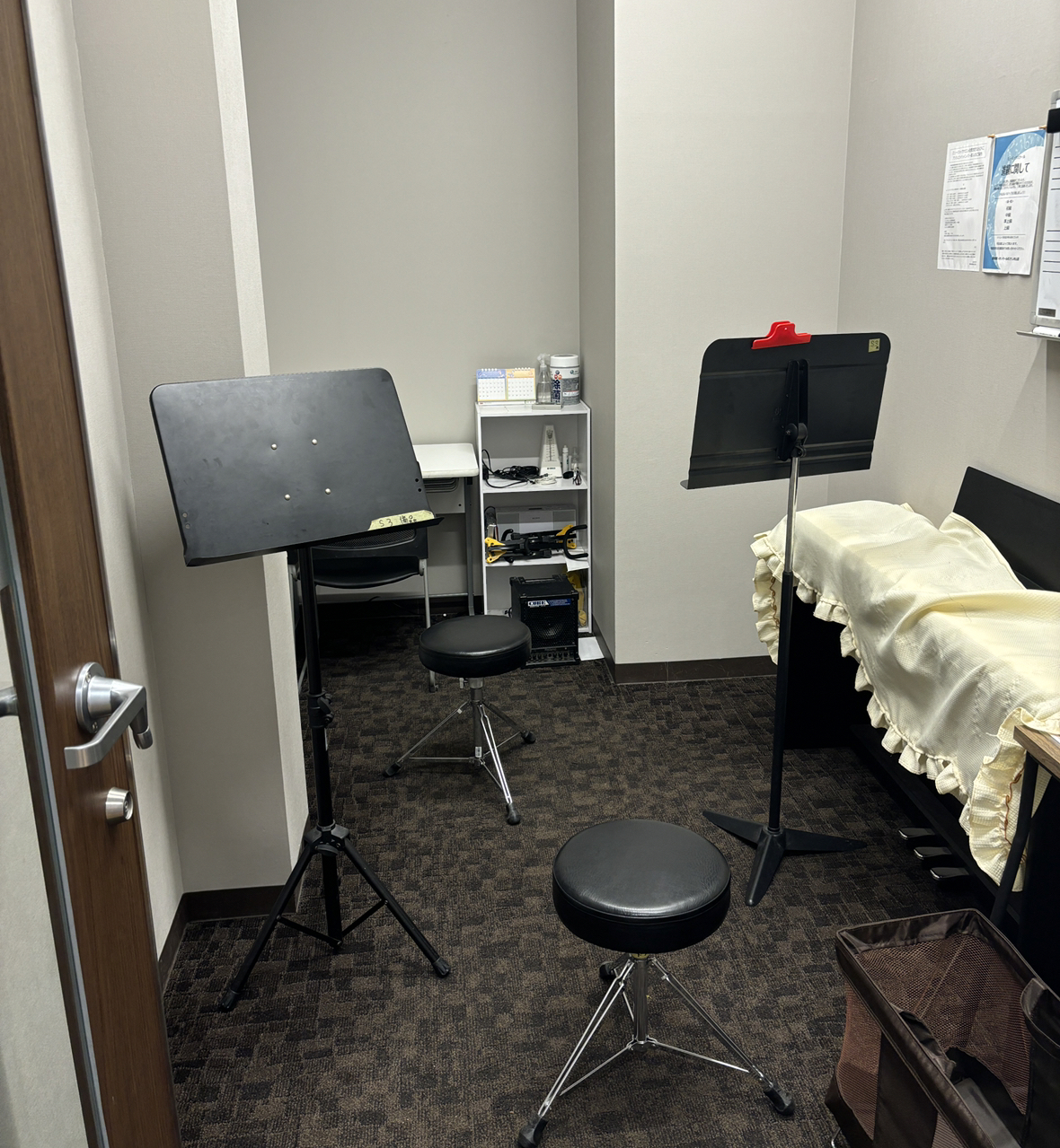 エアコンがある防音のお部屋です!荷物置き場や、楽器の準備ができる机もございます。