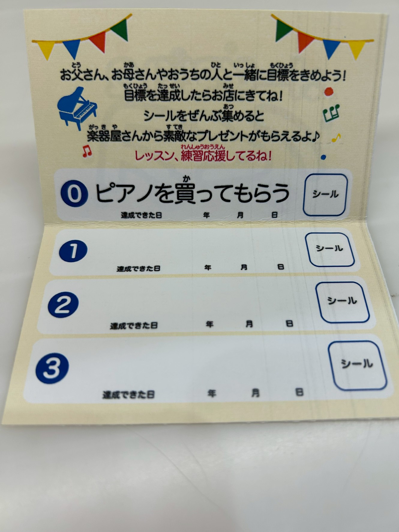 ピアノ購入時に、お子様専用カードとしてお渡し、お子様自身、ご家族様でピアノレッスンの目標を決めて頂きます。