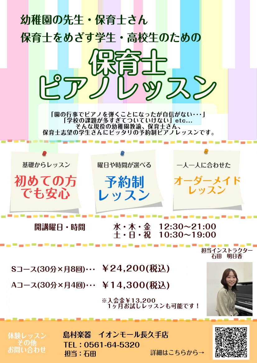 こんにちは!イオンモール長久手店ピアノインストラクターの石田です。