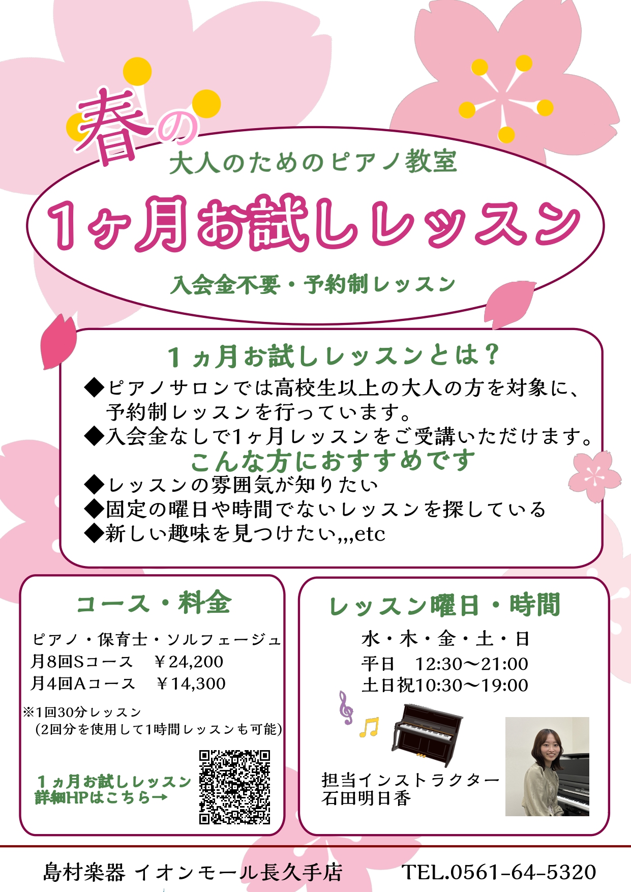 大人のピアノ教室 春の1ヶ月お試しレッスン 長久手市/日進市/みよし市/名古屋市名東区/守山区