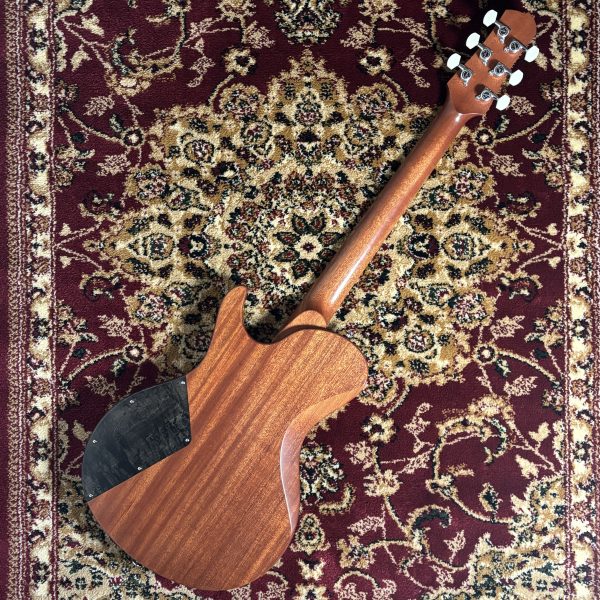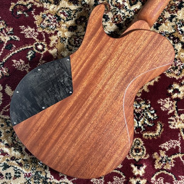 こちらはセットネックモデル。レスポールタイプながら3kgを切る軽量さです。ボディバックに希少なジェニュインマホガニー、トップにはキルトメイプルをあしらった逸品です。プレーントップモデルと比較するとこちらの方が低域が強く出る傾向にあります。また、重量もジェニュインマホガニーの方が若干軽い個体が多くなっています。