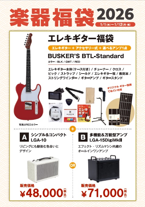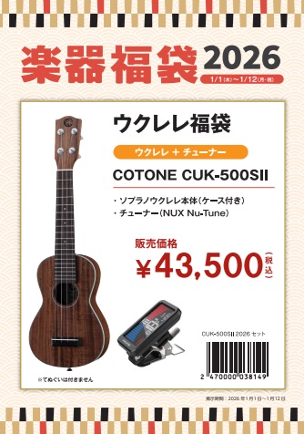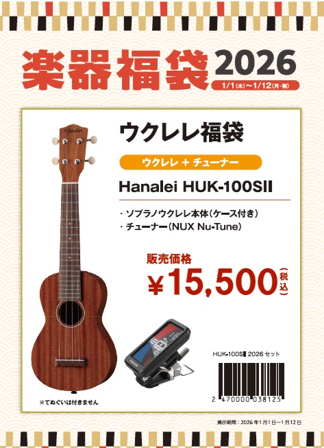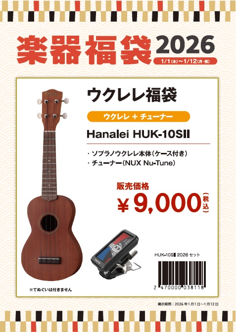 数量限定で、ウクレレ、アコースティックギター、エレキギター、エレキベースの福袋をご用意しております!