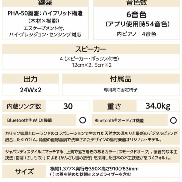「きよら」は、天然木のあたたかみと流れるような曲線美をまとった、インテリアに調和する上質なデザインを特徴として、2015年の発売以来多くの方々に支持されてきたデジタルピアノです。
