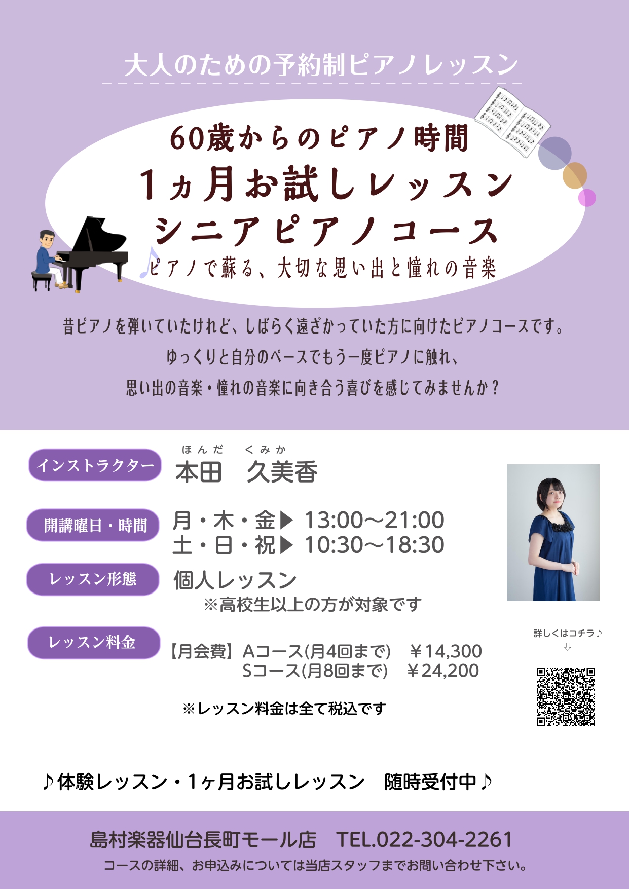 【60歳からのピアノ時間 1カ月お試しレッスン シニアピアノコース】