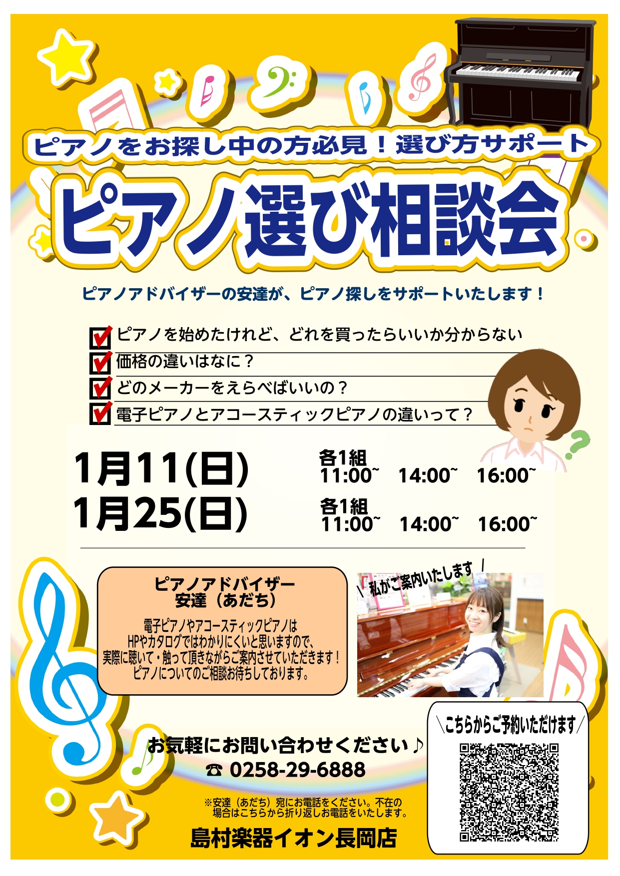 ![こんにちは!島村楽器イオン長岡店ピアノアドバイザーの安達です!当店では、各メーカーの定番&人気機種を厳選して揃えておりますので、実機をご覧いただきながらじっくり丁寧に説明いたします。どうぞお気軽にお電話ください。 CONTENTSお問い合わせこんなご質問にお答え致します! ①ピアノってどうやって選べ […]](https://www.shimamura.co.jp/shop/nagaoka/wp-content/uploads/sites/45/2025/08/20250801-abdd3e4fa4c621f38e48e14fbff6decb.jpg)