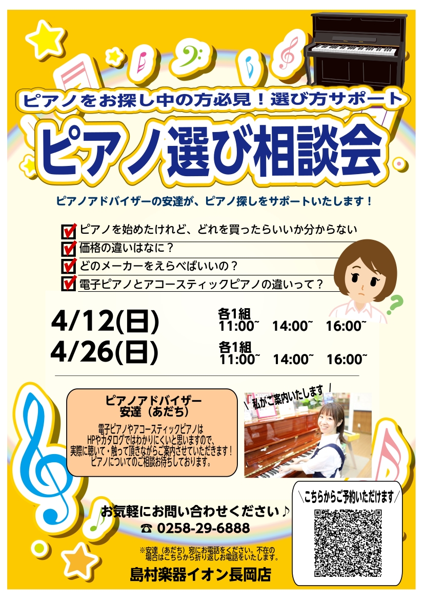 ![こんにちは!島村楽器イオン長岡店ピアノアドバイザーの安達です!当店では、各メーカーの定番&人気機種を厳選して揃えておりますので、実機をご覧いただきながらじっくり丁寧に説明いたします。 駐車場料金も無料なので心行くまでゆっくりとご覧いただけます。長岡、新潟、十日町、上越、魚沼市にお住まいの方必見です! […]](https://www.shimamura.co.jp/shop/nagaoka/wp-content/uploads/sites/45/2025/08/20250801-abdd3e4fa4c621f38e48e14fbff6decb.jpg)