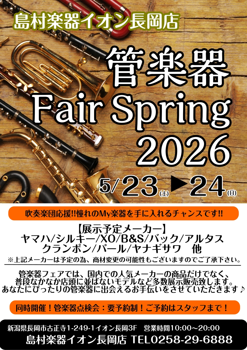 皆様こんにちは 島村楽器 イオン長岡店 管楽器担当の安達です♪ この度、2026/5/23(土)・5/24(日)の2日間、管楽器フェアを開催することになりました。 学生さん向けモデルから大人の趣味層の方向けのモデルまで幅広く展示致します! フルート、サックス、クラリネット、トランペット、トロンボーン […]