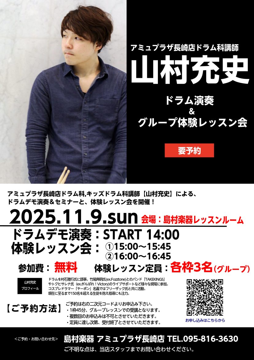 ![皆様こんにちは!11/9(日)に当店ドラム科講師山村充史による、ドラム演奏&グループでの体験レッスン会を店頭レッスンルームで開催いたします!観覧も参加も無料のイベントとなっております。皆様のたくさんのご来場お待ちしております! CONTENTS【ドラム科講師】山村 充史ドラム演奏イベントの詳細体験レ […]](https://www.shimamura.co.jp/shop/nagasaki/wp-content/uploads/sites/72/2025/10/20251023-shima251023-0174.jpg)