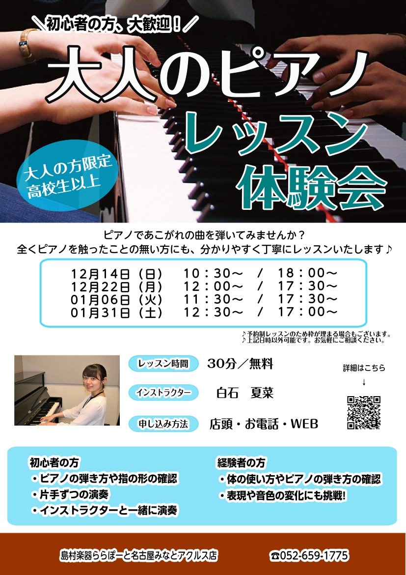 今年の内に「やってみたかった」を叶えよう!大人のためのピアノレッスン体験会【名古屋市港区・南区・熱田区・中川区/ピアノ教室】