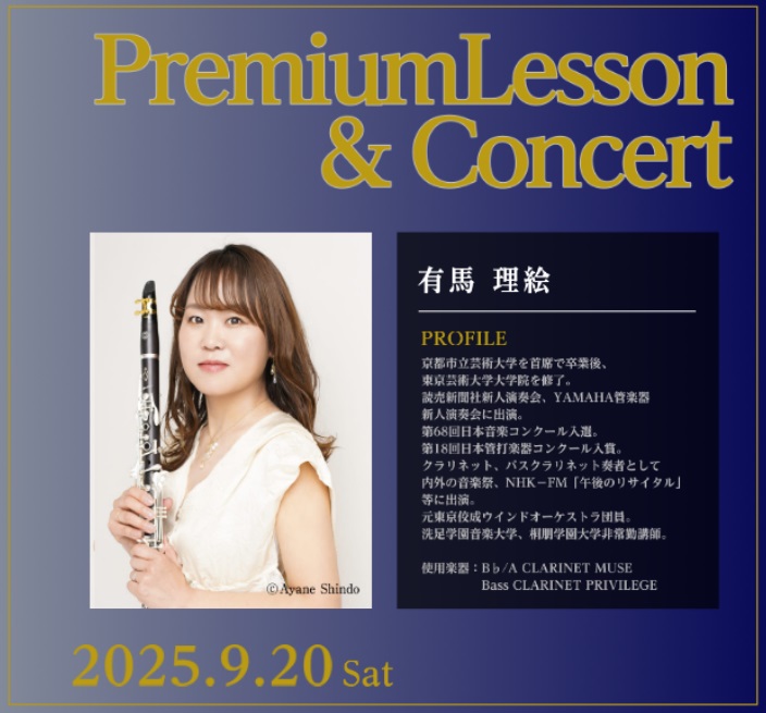 クラリネットフェスタ特別イベントとして クラリネット奏者 有馬理絵さん をお迎えし、プレミアムレッスン&ミニコンサートを開催致します。