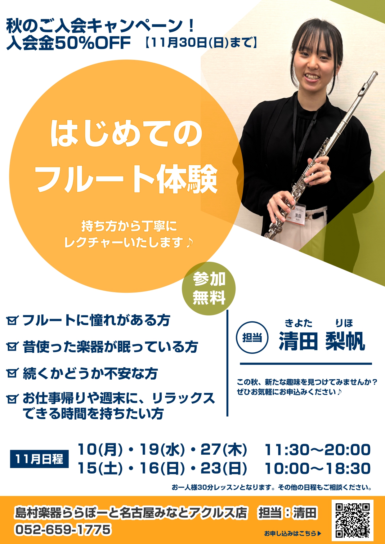 ![初めての方もお気軽にご参加いただけるフルート体験会です! こんにちは!フルートインストラクターの清田です!こちらでは11月の体験会をご案内いたします。 フルートが全く初めての方、自分に出来るか不安な方、憧れがある方・・・どんな方でも大歓迎!皆さんお気軽にご参加ください。※高校生以上が対象です CON […]](https://www.shimamura.co.jp/shop/nagoya-aquls/wp-content/uploads/sites/186/2025/11/20251106-shima251106-0187.jpg)