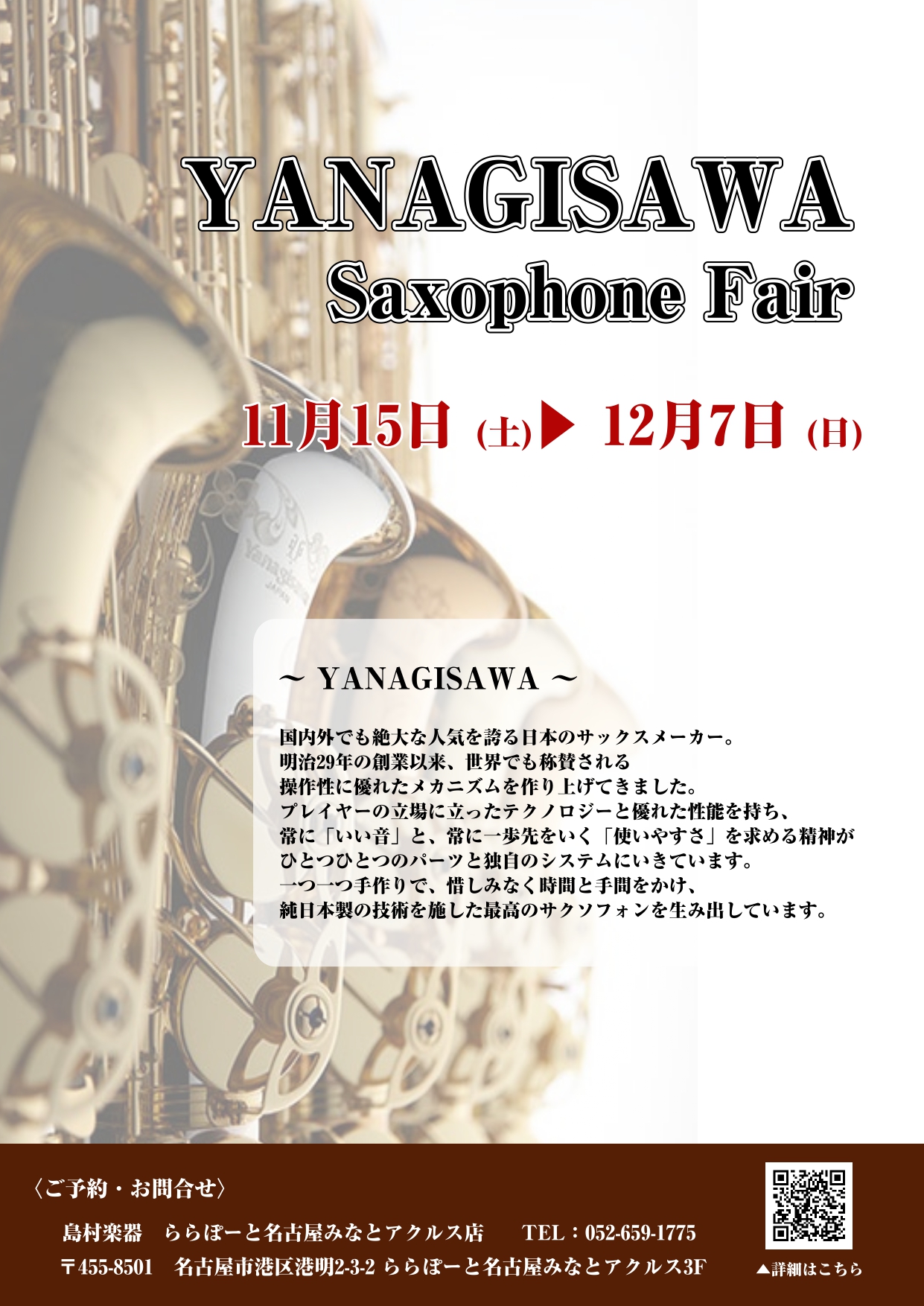 ![CONTENTSヤナギサワサックスフェア開催!!展示ラインナップご予約・お問合せヤナギサワサックスフェア開催!! ヤナギサワのサックスの吹き比べ、即納が可能です!サックスの購入を検討されている方は是非この機会にお試しください! 展示ラインナップ ソプラノサックス アルトサックス テナーサックス ※展 […]](https://www.shimamura.co.jp/shop/nagoya-aquls/wp-content/uploads/sites/186/2025/11/20251110-shima251110-0174.jpg)